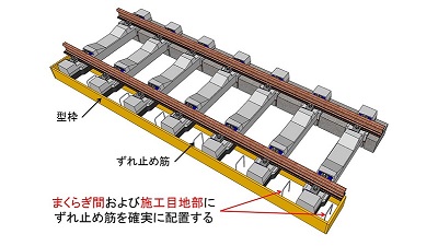 ・まくらぎ端面とせん断キーに型枠を当てるだけで正確な仕上がり寸法が得られるようにすることにより、型枠の位置調整を簡略化できます。