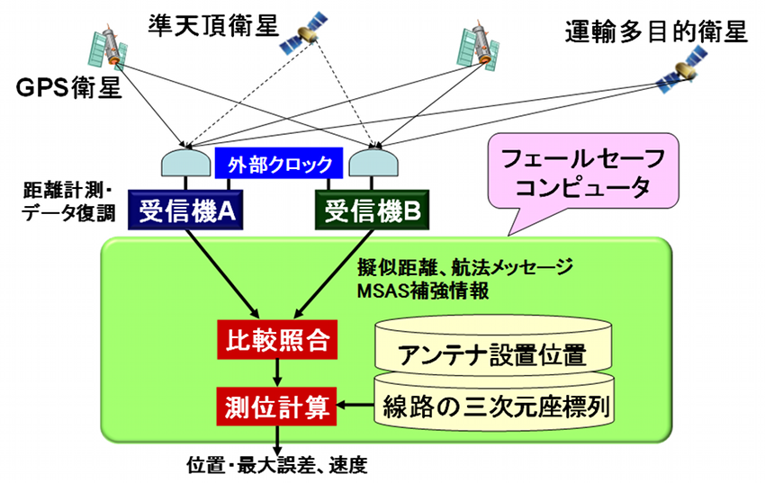 本測位手法では、2つのGNSS(全地球航法衛星システム:Global Navigation Satellite System)受信機を外部クロックにより同期させ、フェールセーフコンピュータ(保安制御用コンピュータ)が、2つの受信機が受信した衛星の放送データを照合するとともに、計測データについて信号強度、疑似距離(測位演算に使用する電波の到達時間から換算した距離)の各種検定を行いながら、走行する線路の三次元座標列への一次元拘束を伴う測位演算を行い、座標を決定します(図1)。測位演算は、受信機の機能を用いないためブラックボックスではなくなり、フェールセーフコンピュータ内で行うことにより処理の安全性が高まります。