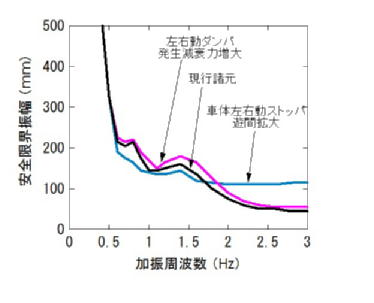 巨大地震から鉄道システムを守るため、各方面から様々な検討が行われています。このうち、車両側からの取り組みとして、ばねやダンパなどの台車部品の特性をはじめとした台車諸元と、地震時の脱線に対する安全性との関係について、車両挙動解析による検討を行ないました。その結果、左右動ダンパの減衰特性など、主に車体支持装置まわりの台車諸元を変更することで、地震時の脱線に対する安全性を改善できることがわかりました(図1)。
