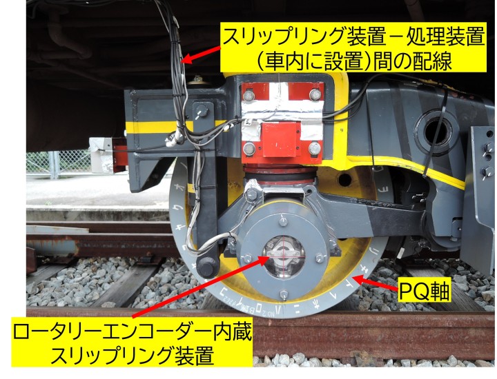 鉄道車両の走行安全性を評価するためには、走行中の車輪・レール間の鉛直方向の荷重(輪重:P)と左右方向の荷重(横圧:Q)を精度よく測定することが重要です。 輪重・横圧の測定(PQ測定)を行うために、車輪にひずみゲージを貼り付けた輪重横圧測定輪軸(PQ軸)を用いることが国内では一般的です。PQ軸による測定においては、回転する車輪から車上にひずみゲージの信号を伝達する必要があります。この信号伝達は、軸端に装着したスリップリング装置により行うことが一般的です。特に連続的に輪重や横圧を測定するためにはロータリーエンコーダーを内蔵したスリップリング装置を用います。輪重・横圧連続測定の概念図を図1に、スリップリング装置を装着した状態の台車を図2に示します。