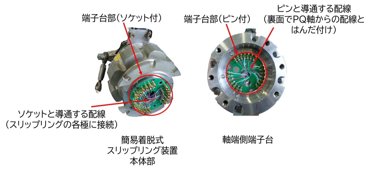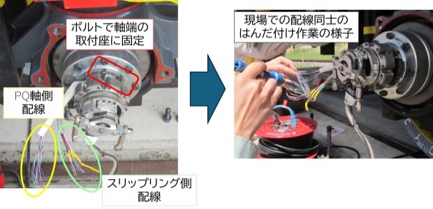 スリップリング装置を装着する際には、PQ軸から引き出された配線と、スリップリング装置側の配線をはんだ付けする必要があります(図3)。このはんだ付け作業は、試験に供される車両の留置可能場所・時間の制約から、作業性の悪い場所で短時間の内に施工する必要がある場合があります。