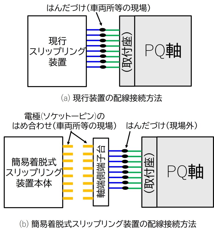 試験車両留置場所での作業時を短時間、かつ簡便にする目的で、簡易着脱式スリップリング装置を開発しました。 簡易着脱式スリップリング装置は端子台部を有するスリップリング装置本体部と軸端側端子台から構成されます(図4)。 簡易着脱式スリップリング装置のPQ軸への接続方法について、現行装置を用いる場合と比較した模式図を図5に示します。簡易着脱式スリップリング装置を使用すれば、時間的猶予があり、作業性が良好な現場外で予めPQ輪軸-軸端側端子台とのはんだ付け作業を済ませておき、現場ではスリップリング本体を端子接続するのみになります。したがって、輪重・横圧測定のための仮設作業を、現行装置を使用する場合よりも効率的に行うことが可能となります。