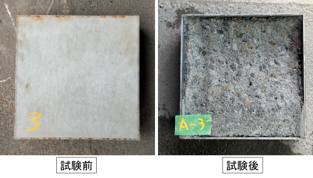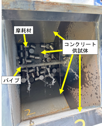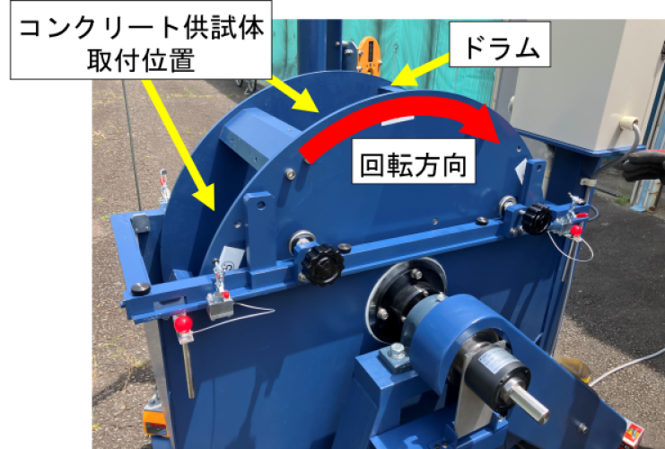 ・コンクリート供試体の設置方法は、コンクリート供試体のコンクリートの打ち込み面をドラムの内側に向けて鋼製型枠ごと設置します(図2)。供試体の数は6体です。