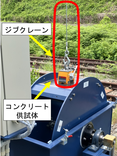 ・コンクリート供試体の取り外しは、試験機に合わせて設けたジブクレーンを用いて行います(図7)。