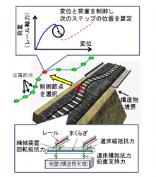 本手法(図1)では、様々な形式の構造物や軌道構造を3次元FEMによりモデル化します。レールやまくらぎは梁要素でモデル化し、道床抵抗力や締結装置は非線形のばね要素でモデル化しています。常時の座屈挙動解析では、レール軸力の上昇を微小なステップに分けて徐々に上げながら、各ステップで最も変形した節点に着目して弧長法を用いて座屈挙動を計算します。残る節点の変位はこの着目節点に従属させて求めて、軌道全体の変形形状を逐次求めていきます。地震時の動的大変形解析では、道床横抵抗力特性に横方向への加振や構造物境界での食い違いの影響等を考慮して、軌道の変形挙動を求めることができます。