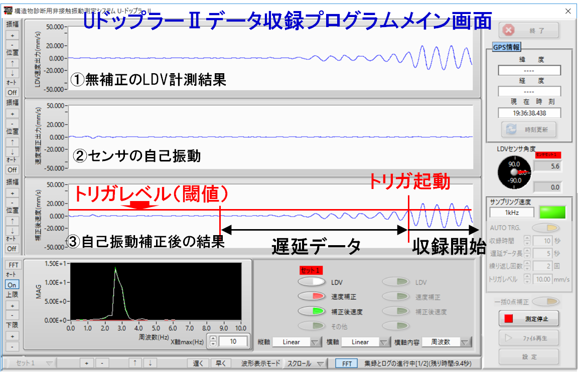 ・自動測定化:データ収録ソフトに列車通過時の構造物振動などを自動測定する機能を追加しました。測定データの振幅が任意に設定できるトリガレベルを超えると測定を開始し、トリガ起動前の遅延データも収録できます(図4)。