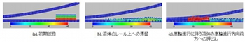 表面張力計算においては、理論解との比較計算によって、概ね妥当な表面張力効果を得られていることを確認しました(図2、図3)。次に、数値シミュレーションによりレール表面に液体(水柱)を設置し、時間経過後の液体の拡散、車輪とレール間の流体の介在、および介在した流体が車輪の転動方向前方に押し出される様子が計算可能となりました(図4、動画1)。