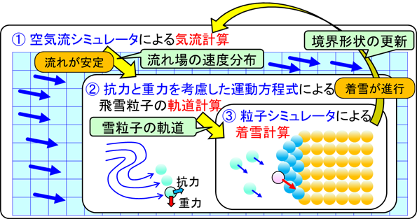 図1に解析手法の計算手順を示します。まず、空気流シミュレータによる気流計算を行います。次に、空気流計算の結果を用いて、飛雪粒子の軌道を計算します。その後、着雪対象への飛雪の速度と着雪対象の向きを考慮した着雪計算アルゴリズムを用いて、着雪計算を行います。着雪形状を空気流シミュレータへと反映し、ふたたび気流計算を行います。このように、空気流計算と着雪計算をくり返し行うことで、着雪の成長を計算することができます。