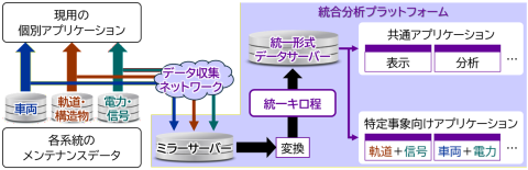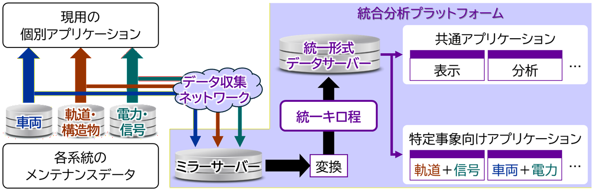 鉄道分野では、車両、軌道、構造物、電力、信号など、設備ごとに担当部署(以下、系統)が分かれており、各系統が個別にデータを管理して、日々のメンテナンス業務を行っています。これらのデータを系統間で横断的に共有・活用することにより、多くのリソースを必要とするメンテナンス業務の省人化が期待されています。しかし、各系統で固有のデータを管理しており、その位置情報の表現形式も様々であることから、位置情報を統合してデータを共有することが困難でした。そこで、系統間でシームレスにデータを共有し、メンテナンス業務の省人化を実現するための鉄道向け「統合分析プラットフォーム」を開発しました。また、実路線において統合分析プラットフォームを構築・活用するための技術を開発しました。