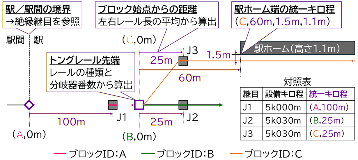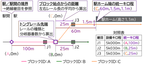 系統間で位置情報の表現形式が異なるという課題を解決するため、統一キロ程では、線路を複数のブロックに分割し、ブロック始点からの相対距離、線路中心からの水平方向の相対距離、レール面からの相対的な高さで位置情報を表現します。また、鉄道事業者が所有する設備台帳から、代表的な位置表現である「キロ程」と統一キロ程との対照表を整備する手法を開発しました。統一キロ程を用いることで、線路単位で地上設備の位置や計測地点を一意に定めることができます。