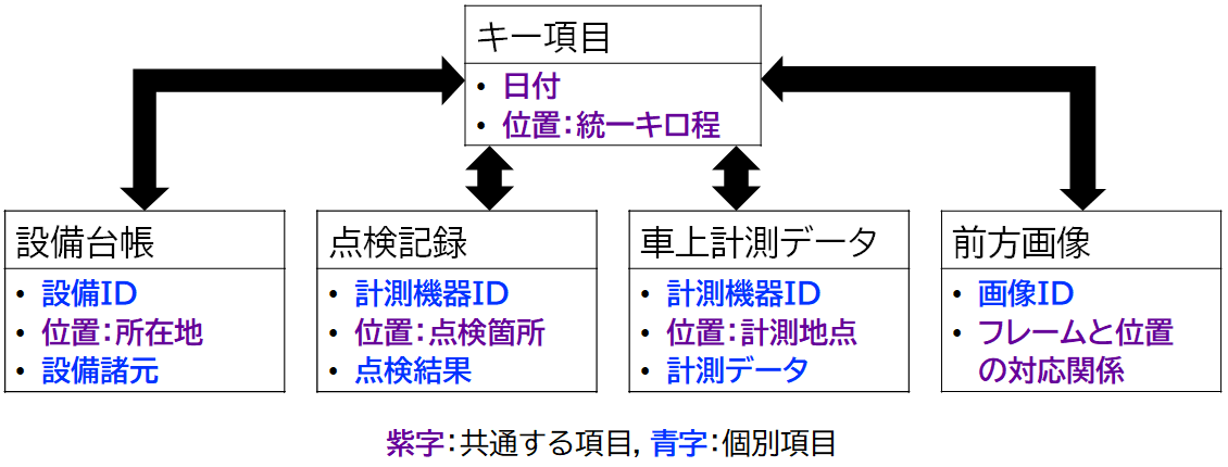 前述の通り、鉄道分野では各系統で固有のデータ形式を設備台帳、点検記録、計測データを管理しています。また、近年は列車前方で撮影した動画像を活用した列車巡視、現地における状況確認、設備位置計測などの代替による省人化が期待されています。そこで、日付や位置などの「共通項目」と系統固有の「個別項目」を組み合わせて、上記のデータをリレーショナル型データベースで一元管理するための「統一形式」を定めています(図3)。これにより、系統間でのシームレスなデータ共有が実現可能となります。