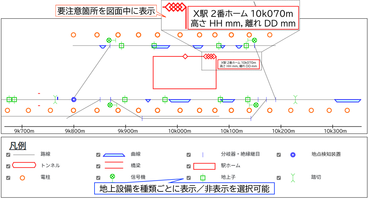 3.1節の統一キロ程、および3.2節の統一形式データを活用した共通アプリケーションの1つとして、線路配置を図式化した配線略図上に、統一キロ程に基づいて全系統の設備位置や要注意箇所を表示するアプリケーションを開発しました(図4)。これにより、設備の状況確認や作業計画策定の支援に寄与できると考えられます。