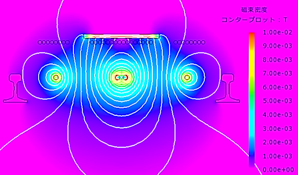鉄道環境においては、コイルの至近に磁性導体であるレールが存在しています。これはコイル間の磁気結合に影響を及ぼすだけでなく、高周波の漏れ磁束が鎖交すると大きな損失を生じます。これを低減するため、軌道中心に磁場を集中(図3参照)させることが可能な8の字(ⅮⅮ)形状コイルを採用しています。また、8の字形状であれば、左右レールと輪軸により構成されるループ回路に鎖交する磁束がキャンセルされるため、このループ電流による損失も抑制されます(図4)。