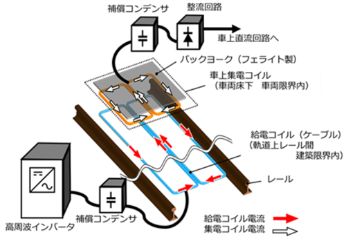 システム構成の概要を図2に示します。軌道上レール間に設置された給電コイルに、高周波インバータから単相高周波交流が供給されます。これにより発生する磁束が、車両床下に搭載された集電コイルと鎖交することで誘導電圧が生じ、電力を伝送することができます。このとき、電力伝送に寄与しない漏れ磁束も同時に生じますが、これによる皮相容量増大をコンデンサ挿入により補償する(LC共振)ことで、システムの力率・効率を最大化します。