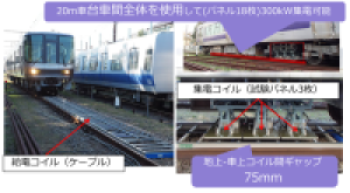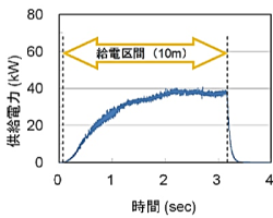 所内試験線に給電コイルを敷設し、集電コイル3パネルによる50kW級電力伝送試験を実施しました。走行中を含め、設計通りの電力伝送が可能であることを実証しました(図5,6)。