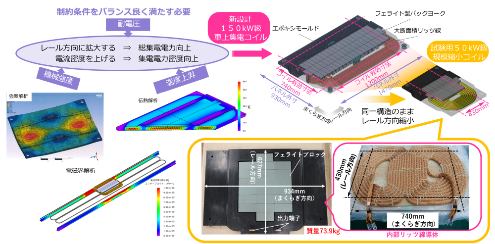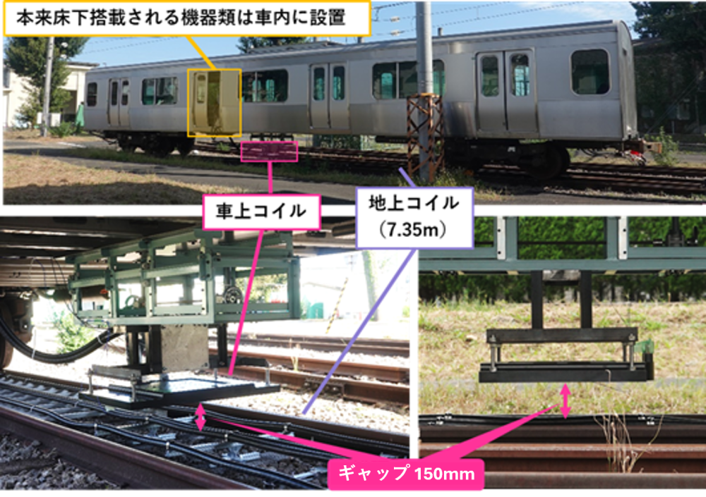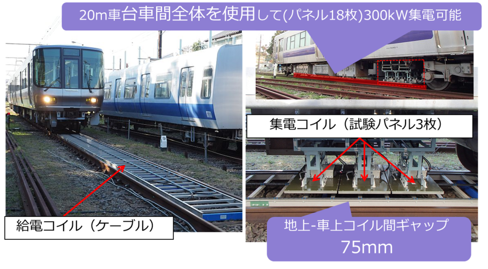 2014年に製作した原理実証システムでは、コイル間ギャップ(メカニカルクリアランス)を許容される最小値とし、車上集電コイルを低圧・薄型に設計することを優先しました。一般的な在来線車両1両につき、最大300kWを集電可能です。また、1台16.7kW集電可能なコイルパネルの搭載台数により、総集電電力を容易に調整可能なモジュラー設計を採用しています。また、地上給電コイルはケーブル1条のみからなる空芯の簡素な構成とし、敷設コストと保線作業への影響の低減を図っています。