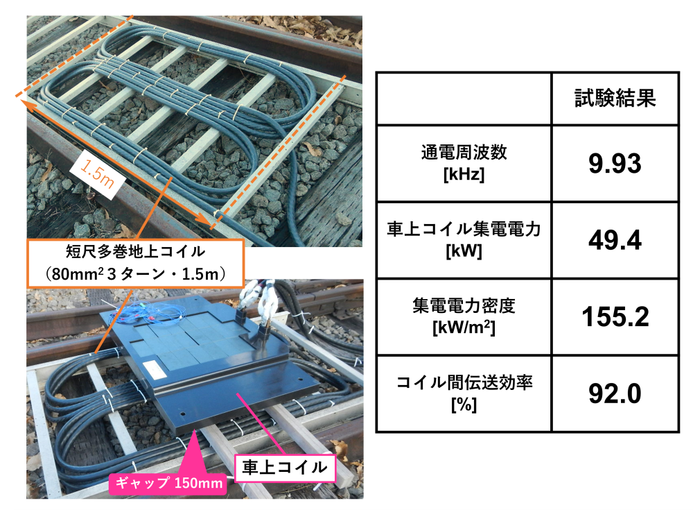 本設計の構造をそのままに、レール方向寸法を縮小した50kW級コイルを製作し、車両取付状態での電力伝送試験(図8)にて設計通りの性能を確認しました。また、短尺地上コイルを使用した試験(図9)において、コイル間効率90%以上での電力伝送を実証しました。