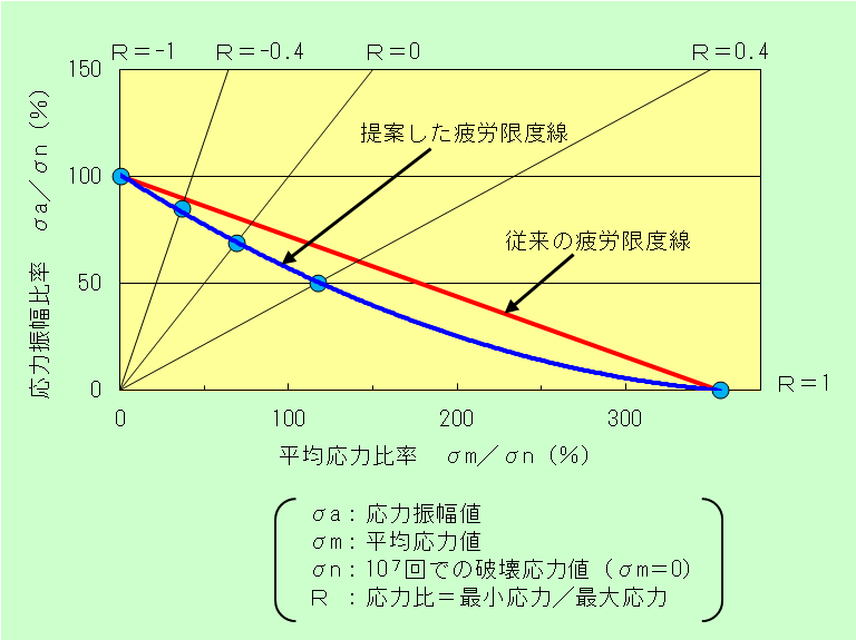 そこで、推進コイル用エポキシ樹脂についてテストピース試験を重ね、図1に示す新たな疲労限度線図を作成しました。新たな疲労限度線図により、平均応力条件下での疲労強度評価がこの線図により可能となります。