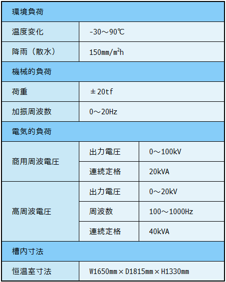 大型恒温恒湿槽(地上コイル対候性試験装置) 主要諸元