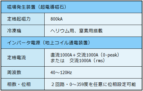 磁場発生装置(励磁した超電導磁石)に地上コイルを対向設置し、インバータを用いてコイルに通電することにより任意の電磁力を加えることで、地上コイルの動的な耐久性評価が可能な試験装置です。専用の大容量インバータ電源から負荷状態応じた直流重畳交流電流を通電することで、低速域から高速域(500km/h相当)にわたって実走行と等価な加振が可能です。機械載荷方式と異なり、電磁力を導体部に直接分布荷重として付加することで、より実態に即した条件での載荷が可能な点が大きな特徴です。また、長期耐久試験に対応した冷却設備と防音室も備えています。