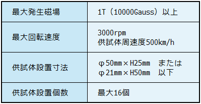 地上コイルには車両走行時に、超電導磁石の強力な移動磁場によって、対面する地上コイルの導体素線に渦電流が誘起され、渦電流損失が発生します。本装置は渦電流損失の定量的な評価を行うことができる装置です。本試験装置は、定置の2対の電磁石に直流磁場を発生させ、供試体を取り付けた円盤を回転させることで超電導磁石が通過する状態を模擬します。装置内に設置されたトルク計や回転計を用いて、磁場の有無によるトルクの変動を計測し、変化分を渦電流損失として算出可能です。また、供試体が磁界中を通過するため、変動磁場を与える試験装置としても使用が可能です。