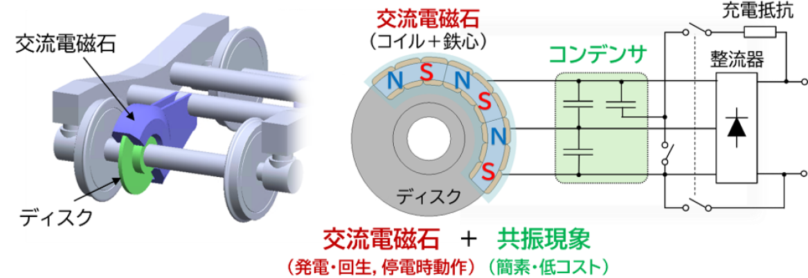 そこで、インバーターなどを用いないシンプルな回路構成により、付随車で簡易的な電気ブレーキを実現可能とする非接触ディスクブレーキ(図1)を提案しました。 この電気ブレーキでは、電磁石とコンデンサの共振現象によって電気を流すことでブレーキ力と回生電力を得ます。