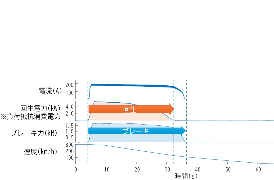 鉄道のブレーキにおいて、インバーターを用いずに電磁石とコンデンサの共振現象によってブレーキと電力回生を行った前例はありません。そこで、原理検証試験を行いました。その結果、実際にブレーキ力を発生しながら、回生電力を得られることが実証されました(図2、図3) 。インバーターレス回生ブレーキを実現可能であることを示しました。