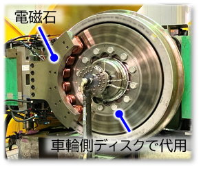 実機を設計する際に必要となる基礎的なデータを取得するため、実機大の要素試験機(図4)を試作し、ディスク温度とブレーキ力の関係などの基礎データを取得しました。停止距離への影響が大きい高速域では、ブレーキトルクへのディスク温度の影響は小さいことなどが分かりました。また、ブレーキ動作状態に応じて複雑に変化する電気的な特性に対して、所望の共振状態に設定するためのコンデンサ容量の決定方法などを考案しました。これらの試験や解析を通じて、設計検討を進めています。