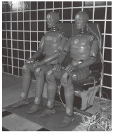 我々が用いている人体モデルはMADYMO(マディモ)というモデルとTHUMS(サムス)というモデル(図2参照)です。マディモは、衝突試験に用いられている衝突ダミー(図3参照、以下単にダミー)を模擬しています。テレビCMで自動車の衝突試験の映像が一時期流れていたので覚えている方もいらっしゃるかもしれません。運転台に人体の代わりにダミーが置かれており、衝突時の車内の映像が流れていました。ダミーはこのような試験において、人体の挙動・傷害の推測に用いられています。一方、サムスは、内臓・筋肉・骨格が含まれており