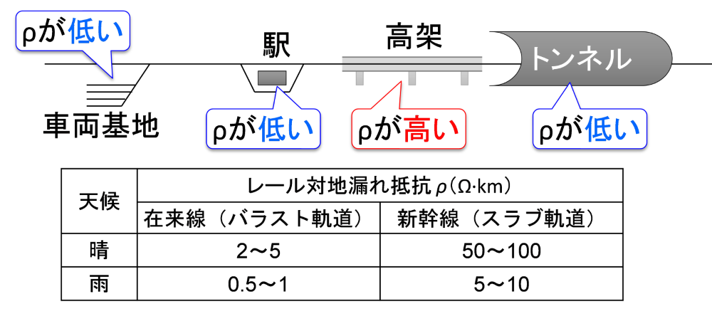 BTき電回路に地絡故障(以下、地絡)が発生した際に、信号機器等が損傷する事象が報告されています。地絡時は、地絡点付近から大地に流出した故障電流が大地やレールを介して吸上線に至り、NFへと吸い上がります。その際に吸上線の周辺で大きなレール電位が発生し、場合によってはその付近に設備された信号機器が損傷します(図1)。地絡に起因した信号機器の損傷防止のための適切な対策を講じるためには、レール電位の定量的な把握が重要となります。しかしながら、レール電位は特にレール対地漏れ抵抗の大きさに左右され、その値は軌道構造、線路配線といった設備形態、地質や天候といった環境条件によって大きく異なることから、シミュレーションを行う際にはその点を十分考慮する必要があります(図2)。