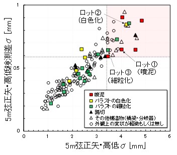 提案した道床劣化箇所抽出法の妥当性を検証するため,営業線で取得した5m弦正矢の高低σと高低検測差σの関係を調査し,軌道検測車の床下画像で確認した道床状態(噴泥,白色化,細粒化,構造物の有無)と比較しました.