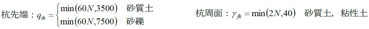 ここで,qtk:杭先端の基準鉛直支持力度(kN/m2),γfk:杭周面の基準鉛直支持力度(kN/m2)N:N値,となります.