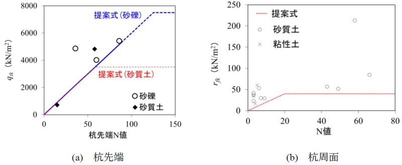 回転切削圧入杭の基準支持力の推定式は地盤のN値をパラメータとし,他工法と同様に載荷試験結果の下限値相当として設定しました.推定式ならびに載荷試験との比較結果を以下に示します.