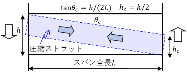 ここに,bw:腹部の幅(mm)、hc:圧縮ストラットの断面方向の幅で0.5hとする,f'cd:コンクリートの設計圧縮強度(N/mm2),d:有効高さ(mm),pc:せん断引張鋼材比(pc=As/(bw・d)),As:引張側鋼材の断面積(mm2),h:断面高さ(mm),L:部材長さ(mm),pw:せん断補強鉄筋比(pw=Aw/(bw・ss)),γb:部材係数で一般に1.3とする.