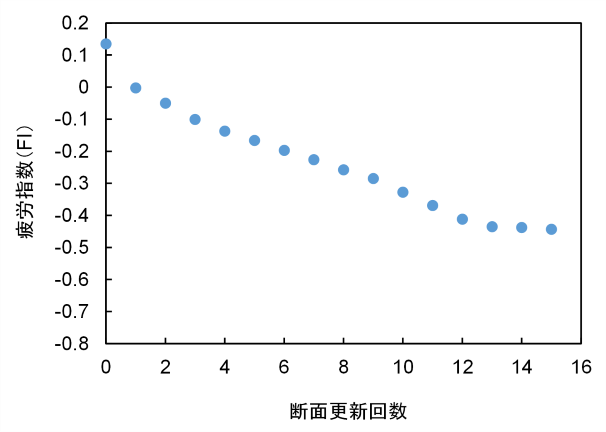 次に,2章に記述したFIモデルを適用し,レール摩耗形状がき裂発生に及ぼす影響について評価しました.適用したレール断面形状別に,算出した疲労指数の結果を図4に示します.摩耗進展によりレール断面形状が変化するにつれて,疲労指数の値は減少していることが確認できます.これは,摩耗進展により車輪/レール形状がなじみ,車輪/レール間の接触面圧が低下したことが主な要因です.