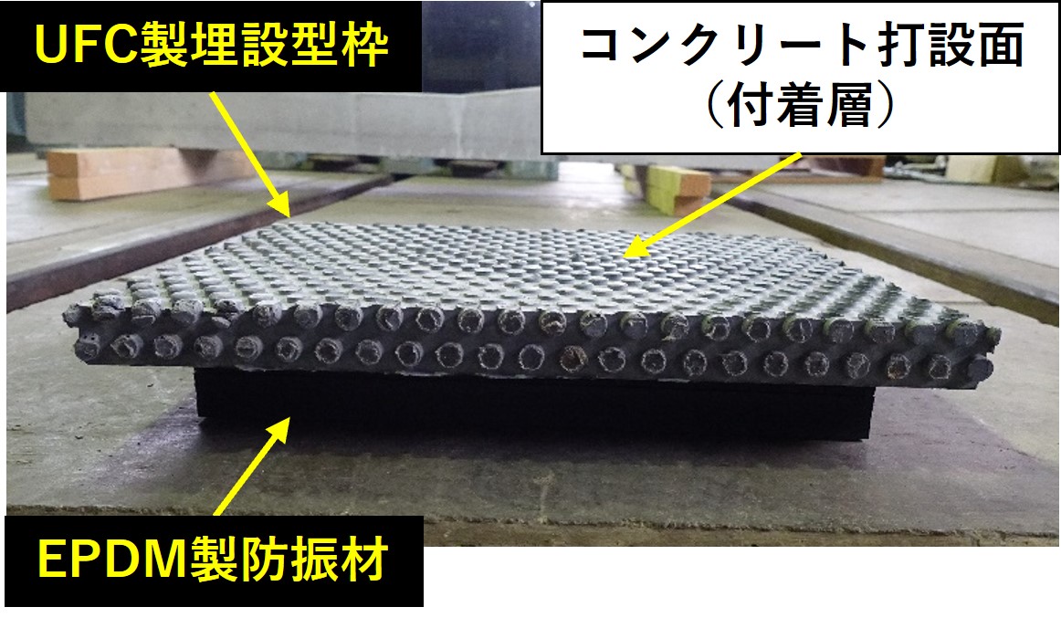 鉄道構造物等設計標準・同解説「軌道構造」に基づき構造設計を行い,日野土木実験所の試験線に約5mの延長でフローティング弾直軌道の試験敷設を行いました.軌道パッドのばね定数は60MN/m,まくらぎパッドのばね定数は30MN/mとし,スラブ下の防振材(EPDM製)については既存のコイルばね防振軌道の実績を参考にばね定数は6.6MN/mとしました.ここで,スラブ下の防振材はUFC製の埋設型枠の凹部に10mm埋め込まれる構造とし,防振材の設置にあたっては,事前に防振材の上面に接着剤を塗布するとともに,防振材が埋設型枠下の所定の位置に配置されるように専用の設置用治具を用いてスラブの側面から防振材を挿入しました(図5および図6).その後,スラブを降下させて埋設型枠と防振材を接着し,問題なく軌道を敷設できることを確認しました(図7).