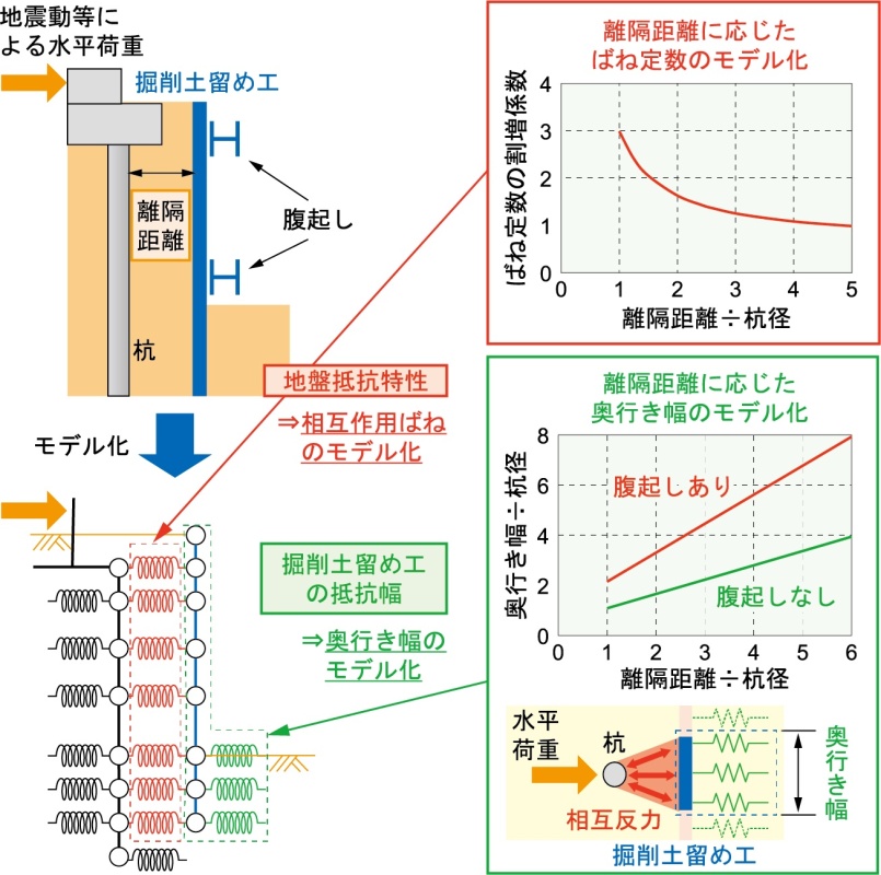 杭と土留めの相互作用メカニズムを考慮して作成した設計手法の概要を図3に示します.一般的な杭基礎ならびに土留めの設計で用いられている2次元の梁ばね解析モデルを基本とし,杭と土留めの間に生じる反力を相互作用ばねでモデル化しました.この相互作用ばねのばね定数に関しては,Steinbrennerの弾性解を応用して離隔距離に応じた割増係数を設定しています.また,離隔に応じて杭の反力を受け持つ土留めの奥行き幅を変化させることとし,具体的な値としては3次元FEMにより設定しました.