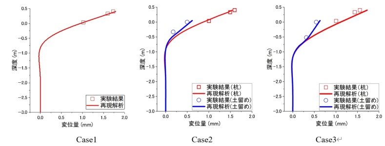 次に,図3に示した設計手法を用いた再現解析を行いました.図6に再現解析の結果として,ここでは各実験ケースにおける杭頭(地表面位置)変位1 mm時の杭と矢板の変位量を示しますが,全てのケースで杭と矢板の挙動を精度よく再現できていることがわかります.また,曲げモーメントやせん断力といった断面力についても再現できていることも確認しており,提案する設計手法の妥当性が確認されました.