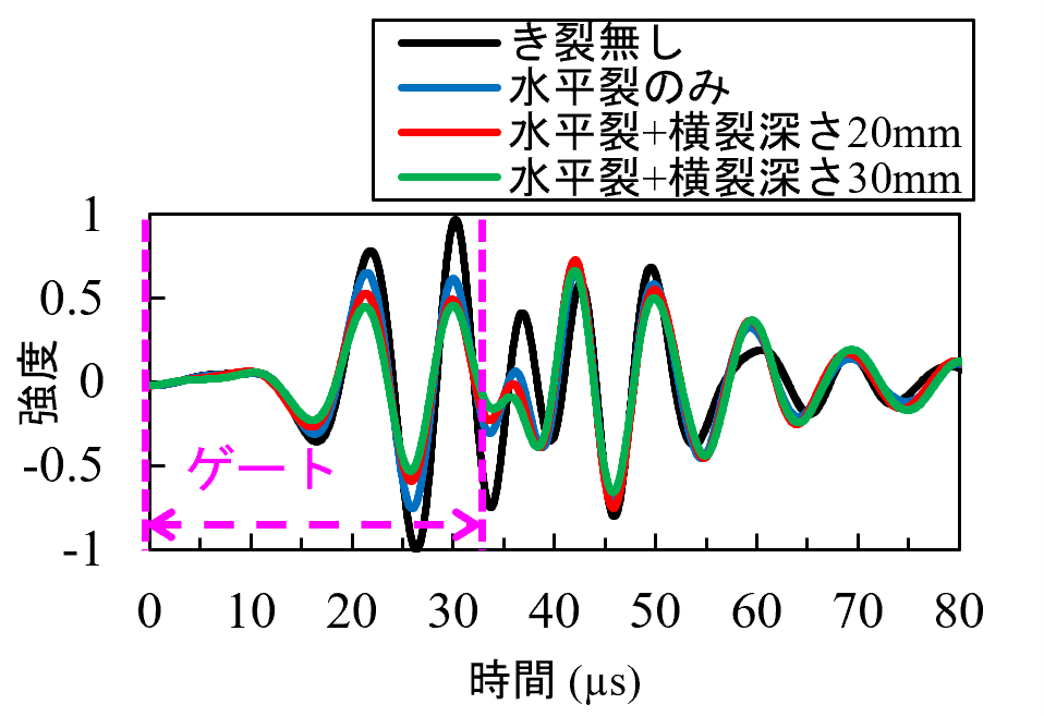 レール頭頂面から5~10mm程度の深さに発生する水平裂と区別して横裂が検知可能か検証するため,図4のような水平裂や横裂を模擬したき裂をレールモデル内に挿入し,シミュレーションを行いました.今回の解析では2章で得られた結果からガイド波の入力周波数を100,120kHzの2種類としました.入力周波数100kHzの超音波が水平裂と横裂に到達した時点でのレール表面変位の変化状況を図5に示します.最初に伝播する数波がこれらのき裂により遮られている様子が確認できます.同様にほぼすべての波がき裂を透過した後の超音波伝播の様子を図6に示しますが,全体的に伝播する波数が増加し,そのうち先頭の数波の変位が水平裂や横裂が存在する場合では大きく減少していることが分かります.そこで得られた受信波形(図7)のうち最初の約3波分のみを抽出するゲートを設定し,ゲート内でのピーク強度を比較しました(図8).入力周波数を100kHzとした場合では,き裂が水平裂のみの条件に比べ,水平裂と横裂が混在した条件ではピーク強度が減少し,0.6程度の閾値を設定することで,水平裂より下に進展した深さ20mm以上の横裂を検知できる可能性が高いと言えます.一方,120kHzとした場合では,横裂の有無によるピーク強度変化が非常に小さいため,横裂の検知は難しいと言えます.ただし水平裂や横裂の形状や位置により,横裂の検知に最適なガイド波の周波数は変化する可能性も考えられるため,さらなる検証を続けていく予定です.