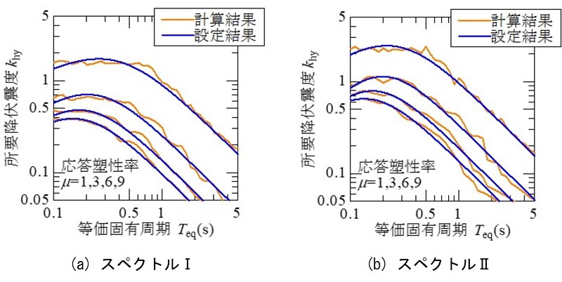 提案手法の有効性を確認するために,耐震標準に記載されている標準L2地震動(スペクトルⅠ,スペクトルⅡ)に対して手法を適用しました.非線形動的解析による所要降伏震度スペクトルの計算結果を図3の橙線に,提案手法による表現結果を図3の青線に示します.どちらの地震動に対しても式(1)によって計算結果を良好に表現できています.
