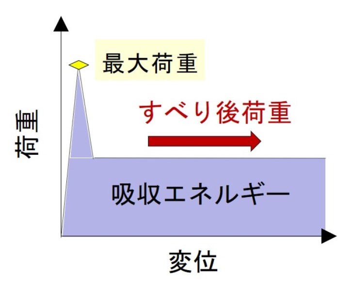 本装置の要は,スリット孔を有するボルト継手部でのエネルギー吸収です.摩擦接合の継手部におけるエネルギー吸収量は摩擦面処理に依存します.摩擦面における荷重-変位関係は,一般に図3のように推移し,静止摩擦で最大荷重に達した後,摩擦面にすべりが生じて荷重が低下し動摩擦に移行します(動摩擦における荷重をすべり後荷重と呼ぶことにします).本装置を支える固定部のサイズは最大荷重により決まり,摺動部はすべり後荷重により決まります.そのため本装置の摩擦面処理は,最大荷重を抑えて下部工への負担を減らしつつ,すべり後荷重を維持できるものが最適であるとして,溶融亜鉛めっきを選定しました.溶融亜鉛めっきは,移動制限装置のような鋼橋の付帯構造にもよく使われる防せい処理方法であり,部材本体と同じ防せい材料を使用することで製作時の手間を減らすことができます.この摩擦面処理を施したプロトタイプを用いて動的載荷試験1)(図4)を行った結果,本装置は目標としていた荷重の推移を示しており,地震時の桁ずれのエネルギーを吸収できることを確認しました.