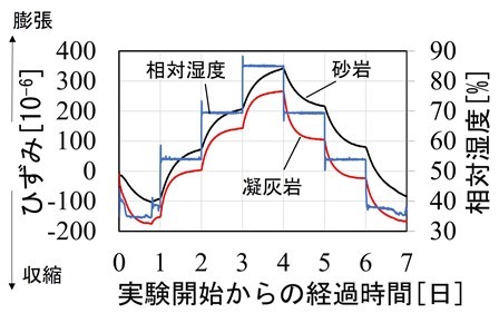 気象条件変動と応力変動の関係を調べるため,試験機内に岩石供試体を静置し,温度か相対湿度の一方のみを変化させた時の変形を測定しました.その結果,湿度上昇時と温度低下時に岩石が膨張する傾向にあり,その変形は湿度や温度の変化から遅れて生じることが明らかになりました(図2,図3).この傾向から,岩石の変形とそれに伴う応力変化には,吸水の影響が大きいことが考えられます.また,湿度と気温の1日の変動の大きさの違いを考慮すると,実岩盤では湿度変化の影響が大きくなることが判明しました.これを踏まえ,多孔質物質の吸湿に関する理論式3)に基づき,気温一定の条件下で湿度変化に対する変形を予測する式を構築し,実測値をよく再現できることを確認しました(図4).