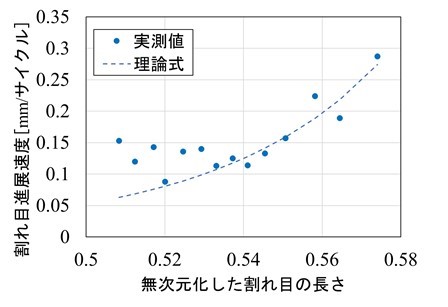 また,繰り返し応力による割れ目の進展に関する経験式として知られるパリス則4)に基づいて,今回の試験条件下で適用可能な割れ目の長さと割れ目の進展速度の関係についての理論式を構築しました.理論式はサイクル数が増加し,割れ目が長くなるほど割れ目の進展速度が増加する試験結果の傾向を概ね再現できました(図7).すなわち,乾湿繰り返しによる割れ目の進展は,概ねパリス則により説明されると考えられます.