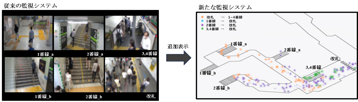 駅構内のOD交通量を把握するために,従来手法に代わるシステムとして,防犯カメラ等の画像解析や数理モデルを活用した「駅構内の旅客分布推計システム」を開発しました.今後は,本システムと各種センサを融合させることで,OD交通量の推計精度とリアルタイム旅客分布の表示精度向上を図るとともに,旅客への混雑情報提供ツールとして活用するための改良を進め,実用化を目指します.
