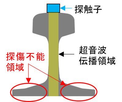 レール損傷を引き起こす要因のひとつに「レール底部の腐食」があります.これに起因するレール損傷を防止するために,鉄道事業者は目視検査による腐食程度の確認や超音波探傷で得られるレール腹部幅直下の底面腐食量の測定によって保守管理をしています1).このうち,超音波探傷検査では,図1に示すように,レール頭頂面に垂直探触子を設置します.これは,レール底部にレール締結装置が存在するため,レール長さ方向を連続的に探傷するにはレール頭頂面から超音波を伝播させる必要があるためです.この方法はレール腹部幅直下を除くレール底部領域が探傷不能領域となり,レール底部に発生する腐食による減肉やき裂をすべて検知できないという問題があります.そこで,現行の探傷システムでは検知できないレール底側部に発生した欠陥を検知可能な手法として,レール底側部の上方に設置した非接触式センサにて欠陥の有無による漏洩磁束の変化を検知する新しい探傷システムを提案し,室内試験により基礎的な検討を行いました2)ので,紹介します.
