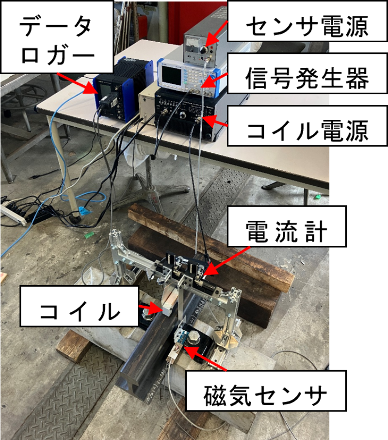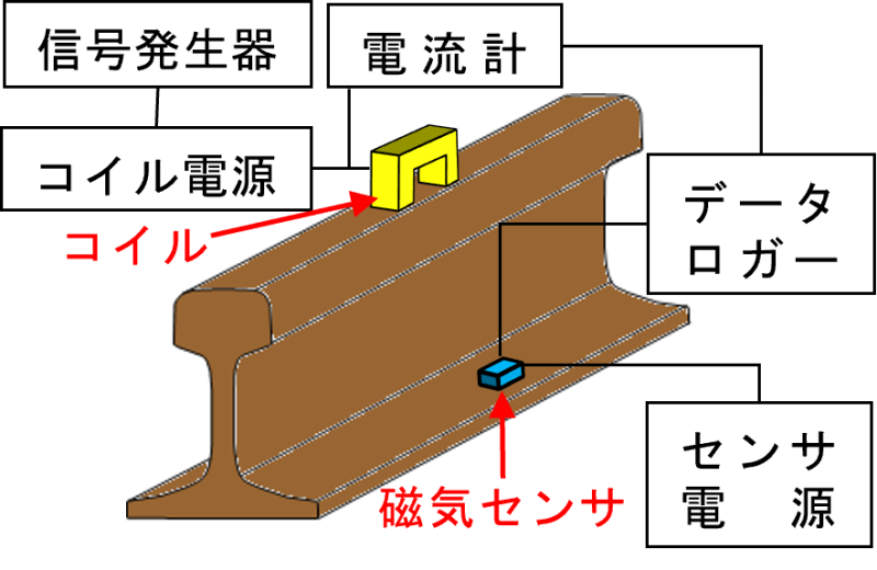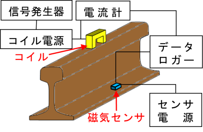 提案する腐食レールの新規探傷システムの構成を図3に示します.信号発生器およびコイル電源により任意の周波数および大きさの交流電流をレール頭頂面に設置したコイルに流すことで,レールとコイルによる磁気回路を形成します.コイルに流れる電流は電流計で計測します.そして,欠陥の有無やサイズの変化によって変化する空間の磁束密度をレール底側部の上方に非接触の状態で設置する磁気センサで計測します.電流計および磁気センサの出力はデータロガーにより記録します.将来的には,これらのシステムをトロリー等に搭載し,移動しながら探傷することを想定しています.その際,レール締結装置と磁気センサが接触しないように,レールと磁気センサの離隔を大きくすることやミリメートルオーダーの欠陥検知が要求されます.