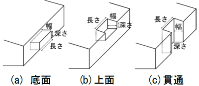 試験装置を図4に示します.コイルと磁気センサは,任意の3軸方向に移動可能な門型の治具に取り付けて,コイルはレール頭頂面,磁気センサはレール底側部端部の直上とし,レール底面からの高さが37mm離れた位置に設置しました.これは,レール締結装置と磁気センサが接触しない距離です.レールは長さ500mmの50kgNレールとし,3号PCまくらぎを模擬した試験ブロックに設置することでレール締結装置を取り付けた状態での試験も実施可能です.本試験ではレールの底側部に表1および図5に示すような人工欠陥を加工しました.