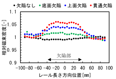 試験結果の一例として,コイルに印加した電流を10Hzの正弦波とし,レール締結装置がない場合に得られる欠陥形状ごとのレール長さ方向の相対磁束密度分布を図6に示します.ここで,相対磁束密度とは,レール長さ方向位置が±90 mm位置における磁束密度p-p値の平均値を1とした時の各位置での磁束密度p-p値の相対値です. 同一試験体における欠陥部と健全部との相対磁束密度の差は,欠陥なしで0.01,底面欠陥で0.03,上面欠陥で0.05,貫通欠陥で0.07でした.これは,新品形状からの断面の欠損量が大きいほど,空気中に漏洩した磁束の量が増加したこと,また,欠陥位置が磁気センサに近いほど,空気中に漏洩した磁束をより多く磁気センサで検知したことを示しています.以上より,レールと磁気センサの離隔が大きい条件であっても,欠陥の有無や欠陥形状を判別できる可能性が示唆されました.