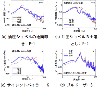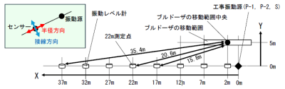 対象とした工事は大型の建設重機による整地作業と土留め作業などで,油圧ショベルの地面叩き(以下,P-1といいます),土落とし(以下,P-2といいます),ブルドーザの往復走行(以下,Bといいます),サイレントパイラーによる鋼矢板の圧入(以下,Sといいます)の異なる4種類の振動源による工事振動を直線状に配置したセンサーで測定しました(図1).