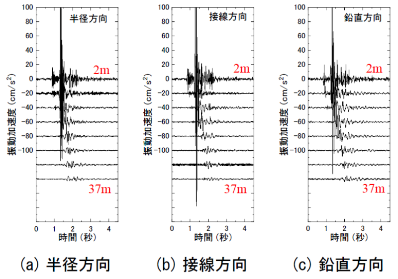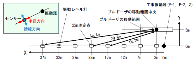 P-1,P-2およびSでは,図1のX方向が半径方向,Y方向が接線方向です.一方,Bの場合,ブルドーザの移動範囲の中央を代表点として,X方向とY方向の回転処理を行い,半径方向と接線方向としました.測定波形の例としてP-2の波形を図2に示します.これらは図1に示した2mから37mのセンサーの測定結果です.P-2では,振動源近傍において接線方向,鉛直方向,半径方向の順に最大振幅が大きくなっています.P-1の結果でも同様の順序でした.また,振動源から離れると共に振動の振幅が減少する様子が見て取れます.SとBの結果では,振動源近傍において半径方向,鉛直方向,接線方向の順に最大振幅が大きくなっていました.